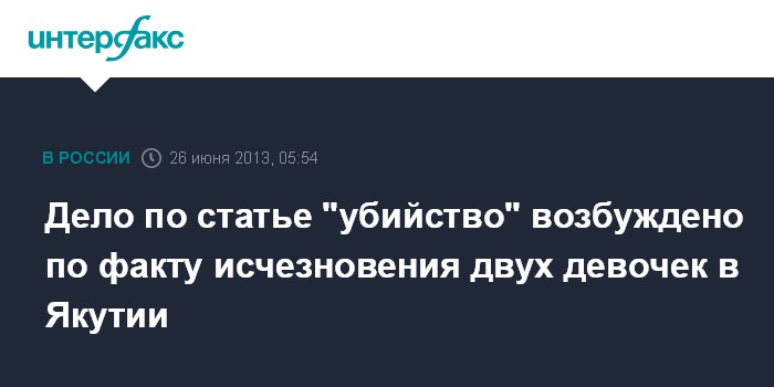 Якутск. 26 июня. ИНТЕРФАКС - ДАЛЬНИЙ ВОСТОК - Уголовное дело возбуждено в Якутии по факту исчезновения двух трехлетних девочек, сообщает СУ СКР по региону.