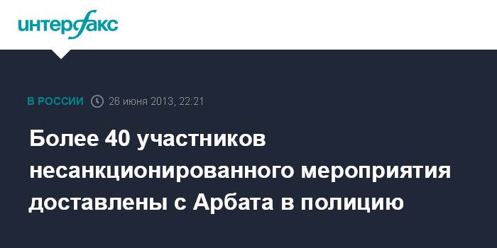 Москва. 26 июня. INTERFAX.RU - Более 40 человек задержаны вечером в среду на улице Арбат в центре столицы, сообщили "Интерфаксу" в пресс-службе ГУ МВД России по Москве.