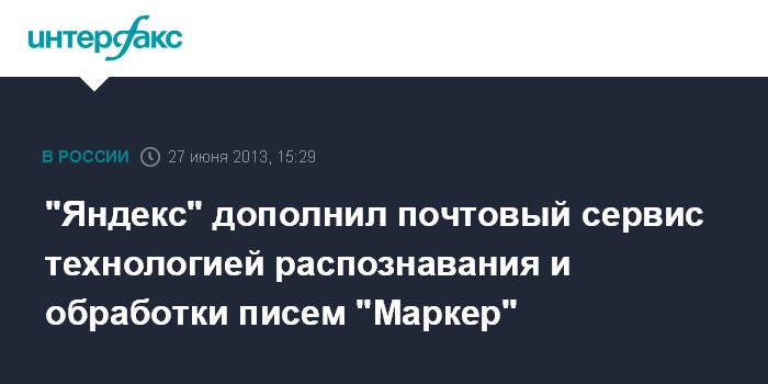 Москва. 27 июня. INTERFAX.RU - Интернет-компания "Яндекс" реализовала в своем сервисе "Яндекес.Почта" технологию автоматического распознавания и обработки писем, получившую название "Маркер", сообщил руководитель персональных сервисов "Яндекса" Антон Забанных журналистам в Москве.