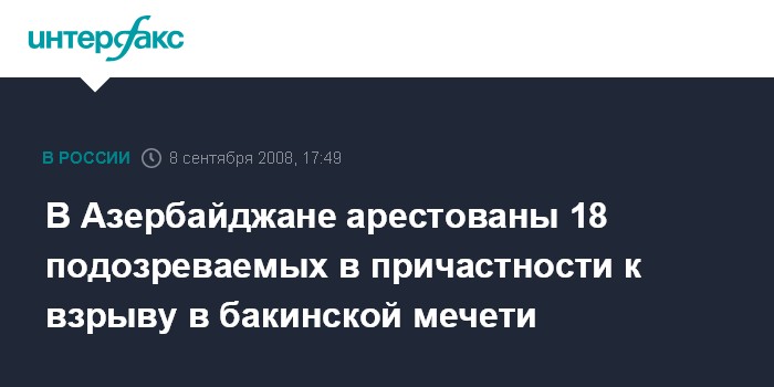 Москва. 8 сентября. INTERFAX.RU - Сотрудники министерства национальной безопасности Азербайджана арестовали 18 человек, подозреваемых в совершении взрыва в мечети Абу-Бекр в Баку 17 августа, говорится в сообщении Центра общественных связей МНБ.