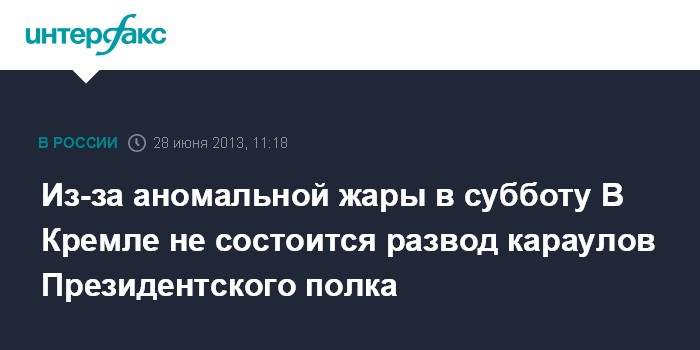 Москва. 28 июня. INTERFAX.RU - Церемония развода конных и пеших караулов Президентского полка в Московском Кремле в субботу, 29 июня, отменяется из-за аномально жаркой погоды, установившейся в столице, сообщил "Интерфаксу" официальный представитель ФСО Сергей Девятов.