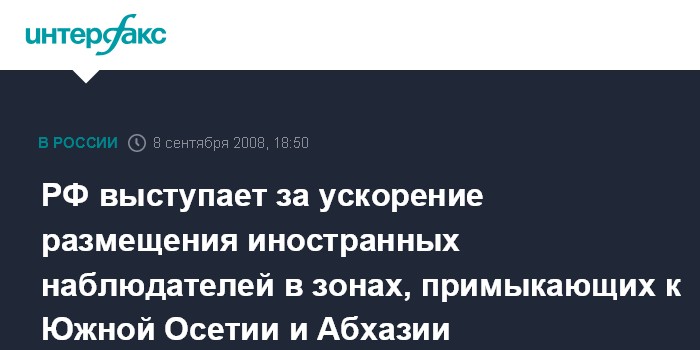 Москва. 8 сентября. INTERFAX.RU - Россия выступает за ускоренное размещение иностранных наблюдателей в зонах, прилегающих к Южной Осетии и Абхазии, включая 200 представителей ЕС.