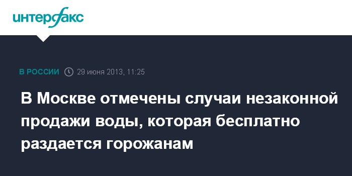 Москва. 29 июня. INTERFAX.RU - Пресс-служба департамента транспорта и развития дорожно-транспортной инфраструктуры Москвы сообщила, что зафиксированы случаи незаконной продажи воды, которая бесплатно раздается москвичам в вестибюлях станций метро в связи с аномальной жарой. "Так, на территории Тимирязевского рынка, находящегося вблизи станции метро Тимирязевская, вода незаконно продавалась неизвестными лицами", - сказали в пресс-службе "Интерфаксу" в субботу.
