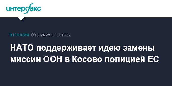 Москва. 5 марта. INTERFAX.RU - НАТО поддерживает намерения ЕС направить миссию полицейских в Косово и подразумевает, что эта структура придет на смену Миссии ООН.