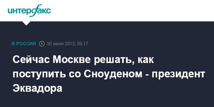 Кито. 30 июня. INTERFAX.RU - В настоящее время российские власти должны определиться, как поступить с бывшим сотрудником ЦРУ Эдардом Сноуденом, заявил президент Эквадора Рафаэль Корреа.