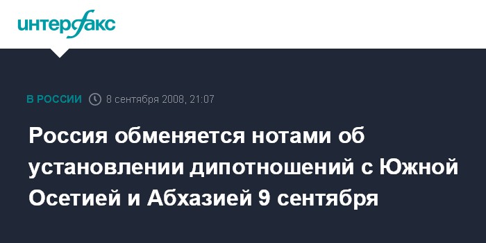 Москва. 8 сентября. ИНТЕРФАКС - Россия обменяется во вторник 9 сентября с Южной Осетией и Абхазией нотами об установлении дипотношений на уровне посольств.