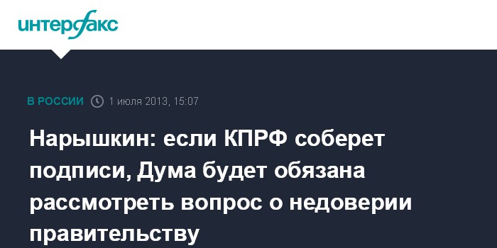 Нарышкин: если КПРФ соберет подписи, Дума будет обязана рассмотреть вопрос о недоверии правительству