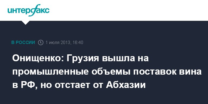 По словам Онищенко, в 2013 г. Абхазия поставила в Россию 444 партии алкогольной продукции общим объемом более 5,1 млн. литров, в том числе, 425 партий вина, 15 партий - винных напитков, три партии - чачи, одну партию - коньяка.