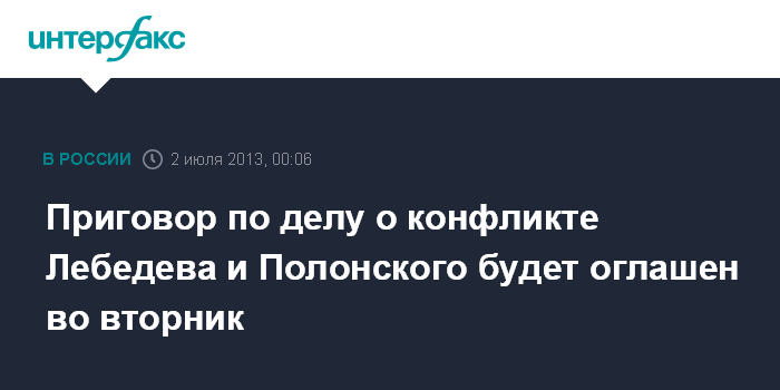Москва. 2 июля. INTERFAX.RU - Останкинский суд Москвы 2 июля огласит приговор банкиру Александру Лебедеву, который обвиняется по делу о нанесении побоев бизнесмену Сергею Полонскому.