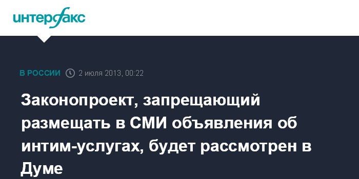 Москва. 2 июля. INTERFAX.RU - Госдума РФ во вторник рассмотрит в первом чтении законопроект, запрещающий размещение в СМИ объявлений об оказании сексуальных услуг.