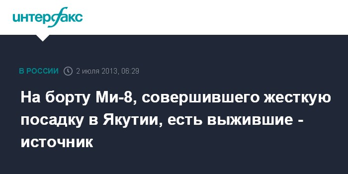 Москва. 2 июля. ИНТЕРФАКС – На борту вертолета Ми-8, совершившего во вторник жесткую посадку в Якутии, есть выжившие, сообщил «Интерфаксу» источник в силовых структурах региона.