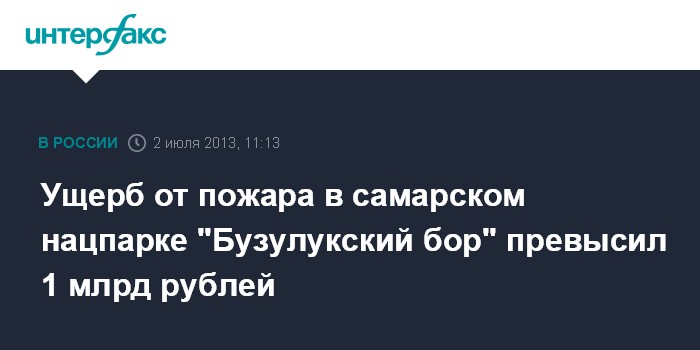 "Ущерб от пожара на территории 90,1 га в нацпарке "Бузулукский бор", по предварительным данным, - 1 млрд 160 млн 917 тыс. рублей", - сказал собеседник агентства.
