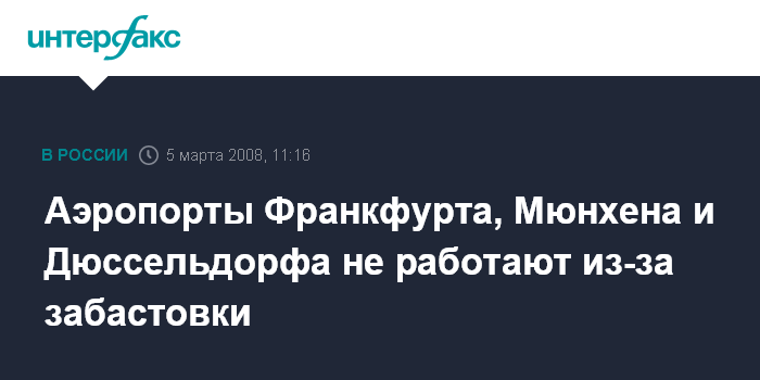 Франкфурт-на-Майне. 5 марта. INTERFAX.RU - Работа крупнейших аэропортов Германии в среду парализована забастовкой операторов по обработке багажа и пожарников, сообщило агентство Bloomberg.