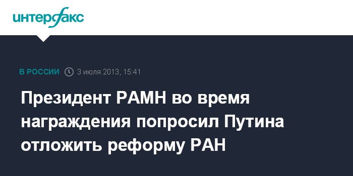 Москва. 3 июля. INTERFAX.RU - Президент Российской академии медицинских наук Иван Дедов на церемонии вручения госнаград в Кремле обратился к главе государства Владимиру Путину с просьбой дать научному сообществу время на подготовку своих предложений по реформе Академии наук.