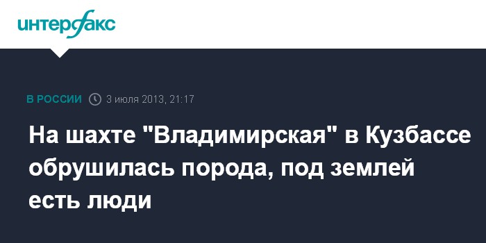 Кемерово. 3 июля. INTERFAX.RU - Обрушение породы произошло на шахте "Владимирская" в 19:58 мск на участке № 1, сообщили агентству "Интерфакс-Сибирь" в пресс-службе ГУ МЧС по Кемеровской области