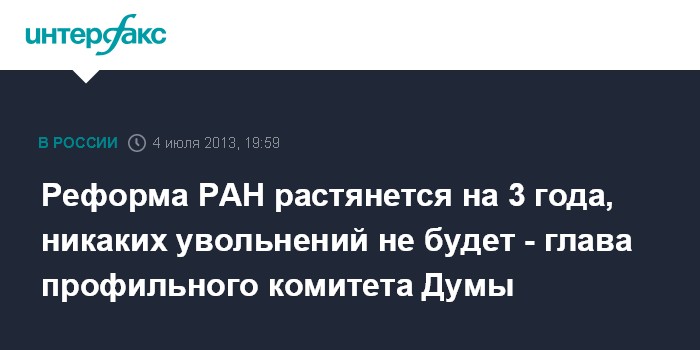 Москва. 4 июля. INTERFAX.RU - Изменения в системе РАН будут происходить постепенно в течение трех лет. В частности, за это время члены-корреспонденты на основании выборов могут стать академиками, аппарат РАН будет ликвидирован, имуществом и институтами РАН будет управлять агентство научных институтов РАН.