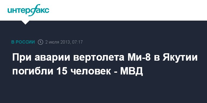 Якутск. 2 июля. ИНТЕРФАКС-ДАЛЬНИЙ ВОСТОК - Вертолет Ми-8 врезался в сопку, предварительно погибли 15 человек, сообщил агентству "Интерфакс-Дальний Восток" начальник пресс-службы МВД республики Станислав Платонов.