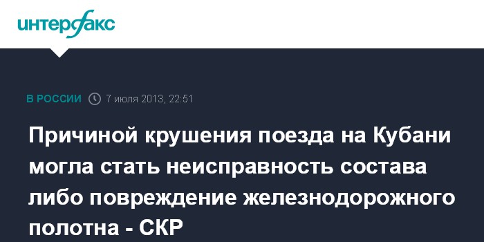 Ростов-на-Дону. 7 июля. ИНТЕРФАКС-ЮГ - Следователи, прибывшие на место крушения пассажирского поезда "Новосибирск - Адлер", выдвинули две предварительные версии причин аварии, сообщили агентству "Интерфакс-Юг" в пресс-службе Южного следственного управления на транспорте СКР в воскресенье вечером.