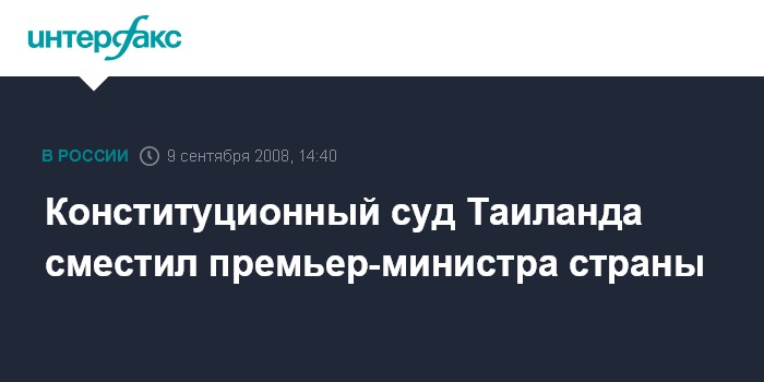 Москва. 9 сентября. INTERFAX.RU - Конституционный суд Таиланда во вторник единогласно проголосовал за смещение Самаки Сунтаравета с поста премьер-министра, сообщает таиландский информационный канал Nation.