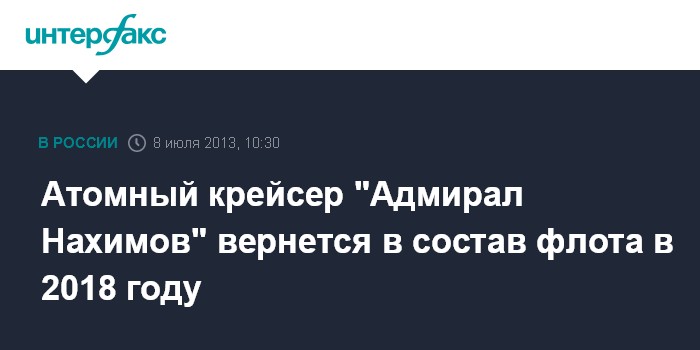 Санкт-Петербург. 8 июля. INTERFAX.RU - Тяжелый атомный ракетный крейсер (ТАРК) "Адмирал Нахимов" после ремонта и модернизации на северодвинском "Севмаше" вернется в боевой состав ВМФ России в 2018 г., подтвердил в субботу "Интерфаксу" в ходе 6-го Международного военно-морского салона генеральный директор предприятия Михаил Будниченко.