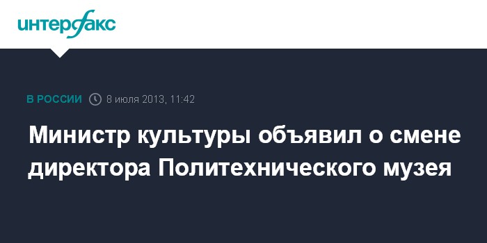 Москва. 8 июля. INTERFAX.RU - Директор Политехнического музея Борис Салтыков уволен приказом министра культуры, на его место назначена заместитель директора Юлия Шахновская, сообщил министр культуры РФ Владимир Мединский