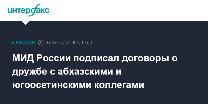 Москва. 9 сентября. INTERFAX.RU - МИД России, Южной Осетии и Абхазии завизировали договоры о дружбе, сотрудничестве и взаимопомощи, сообщил глава МИД РФ Сергей Лавров.