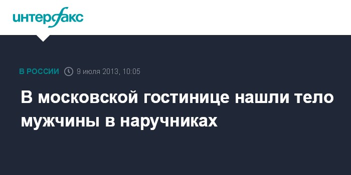 Москва. 9 июля. INTERFAX.RU - Тело мужчины скованного наручниками обнаружено в ванной одного из номеров гостиницы "Шахтер" на юго-востоке Москвы, сообщил "Интерфаксу" источник в правоохранительных органах.