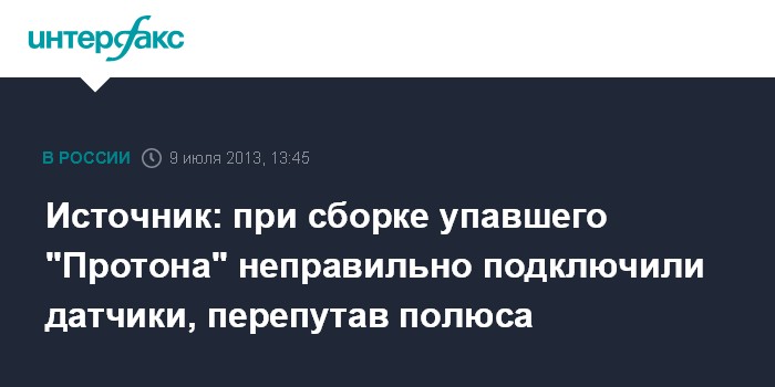 Источник: при сборке упавшего "Протона" неправильно подключили датчики, перепутав полюса