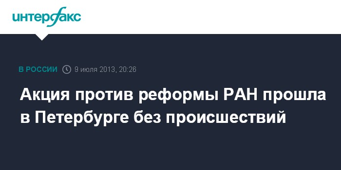 Санкт-Петербург. 9 июля. INTERFAX.RU - Митинг против реформы Российской академии наук прошел на Марсовом поле в Петербурге без происшествий, сообщили "Интерфаксу" в ГУ МВД по северной столице.