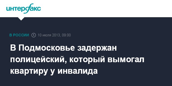 Москва. 10 июля. INTERFAX.RU - Подмосковный полицейский стал фигурантом уголовного дела о похищении инвалида для переоформления его квартиры, сообщили в среду "Интерфаксу" в пресс-центре МВД.