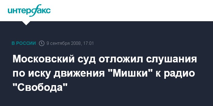 Москва. 9 сентября. INTERFAX.RU - Бабушкинский суд Москвы отложил на 26 сентября предварительные слушания иска о защите чести и достоинства детско-юношеского движения "Мишки" (один из проектов движения "Наши") к радиостанции "Свобода", сообщил адвокат движения Сергей Жорин.