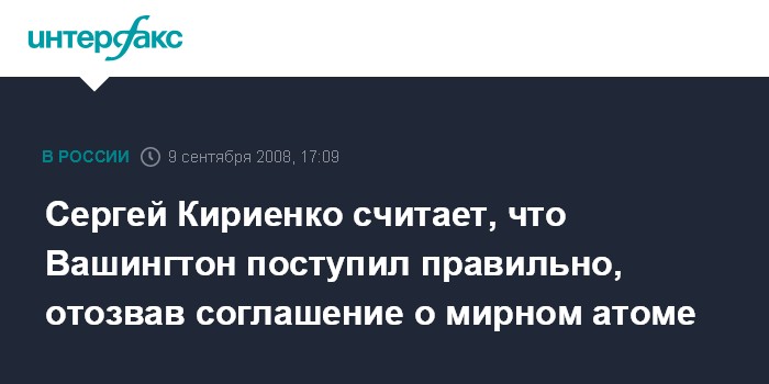 Ереван. 9 сентября. INTERFAX.RU - Глава госкорпорации "Росатом" Сергей Кириенко считает, что администрация США поступила правильно, отозвав из Конгресса соглашение с Россией о сотрудничестве в сфере мирного атома, поскольку в предвыборный период возможность его ратификации была маловероятна.
