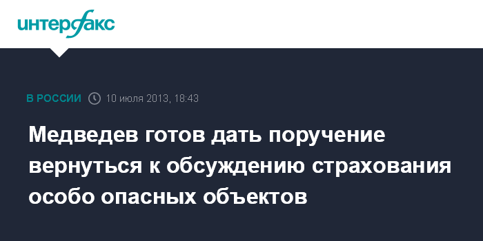 Москва. 10 июля. INTERFAX.RU - Премьер-министр РФ Дмитрий Медведев на встрече с членами бюро правления РСПП сообщил, что готов дать поручение вернуться к дискуссии о порядке страхования особо опасных объектов.