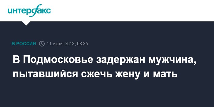 Москва. 11 июля. INTERFAX.RU - Мужчина попытался сжечь жену и мать в Серпуховском районе Подмосковья, сообщили "Интерфаксу" в пресс-центре МВД России.