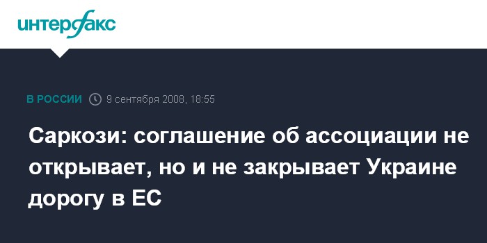Москва. 9 сентября. INTERFAX.RU - Президент Франции Николя Саркози заявил, что соглашение об ассоциации между Украиной и ЕС не открывает, но и не закрывает дорогу Украины в Евросоюз. "Ассоциативное соглашение не закрывает дорогу, также как и не открывает никакой дороги", - сказал Николя Саркози, отвечая на вопросы журналистов.