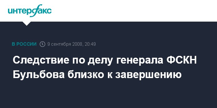 Москва. 9 сентября. ИНТЕРФАКС - Следствие по делу генерал-лейтенанта ФСКН РФ Александра Бульбова, обвиняемого в незаконном прослушивании телефонных переговоров, завершится в ноябре этого года.