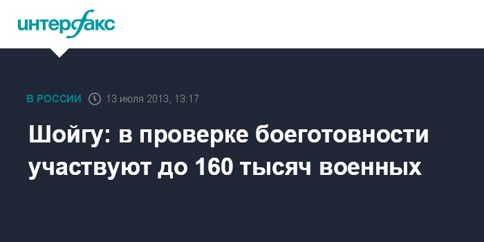 "Общая численность привлекаемых к проверке боеготовности войск составила на вчерашний день до 81 тысячи военнослужащих, на сегодняшнее утро - до 160 тыс военнослужащих, около одной тысячи танков и боевых бронированных машин, 130 самолетов дальней, военно-транспортной, истребительной, бомбардировочной и армейской авиации, а также до 70 кораблей и судов Военно-морского флота", - сообщил министр обороны РФ генерал армии Сергей Шойгу на селекторном совещании в ситуационном центре военного ведомства