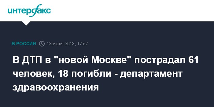 Москва. 13 июля. INTERFAX.RU - По предварительным данным, 61 человек пострадал в результате ДТП в "новой Москве" в субботу, сообщил журналистам первый замглавы департамента здравоохранения правительства Москвы Николай Плавунов. "Четырнадцать человек погибли на месте происшествия, из них один ребенок", - сказал Н.Плавунов.