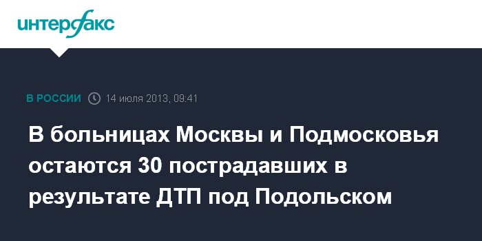 Москва. 14 июля. ИНТЕРФАКС - По данным на 8:00 воскресенья в медучреждениях Москвы и Подольска остаются 30 пострадавших в результате ДТП в "новой" Москве в субботу, сообщил "Интерфаксу" источник в медицинских кругах столицы.