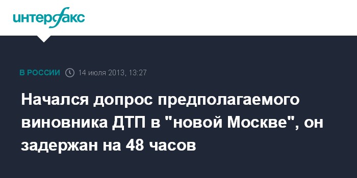 Москва. 14 июля. INTERFAX.RU - Полицейские следователи начали допрашивать предполагаемого виновника аварии с "Новой Москве", сообщили "Интерфаксу" в пресс-службе ГУ МВД по Москве. "Виновник ДТП задержан на 48 часов, следователи проводят его первый допрос", - сказал представитель главка.