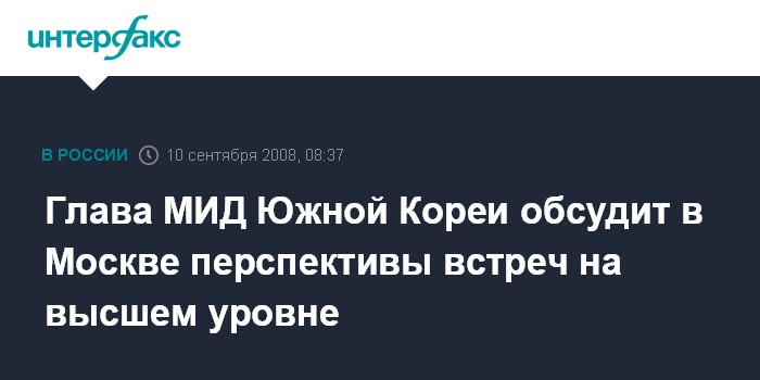 Москва. 10 сентября. INTERFAX.RU - Глава МИД Южной Кореи Ю Мен Хван, как ожидается, обсудит во время своего визита в Москву ход подготовки визита в Россию южнокорейского президента Ли Мен Бака. "10 сентября министр проведет встречу со своим российским коллегой Сергеем Лавровым, где будет затронута эта тема", - сообщили "Интерфаксу" в пресс-службе посольства Южной Кореи в Москве.