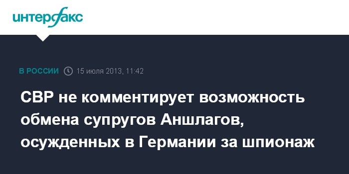 Москва. 15 июля. INTERFAX.RU - В Службе внешней разведки (СВР) РФ воздерживаются от каких-либо комментариев по поводу сообщений о супругах Андреасе и Хайдрун Аншлаг, осужденных в Германии по обвинению в шпионаже в пользу России.