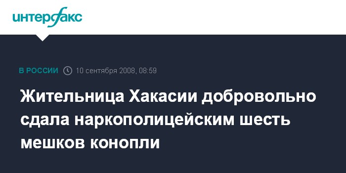 Москва. 10 сентября. INTERFAX.RU - Жительница поселка Копьево Орджоникидзевского района Хакасии добровольно скосила на своем участке около 15 кг конопли и сдала шесть мешков с урожаем сотрудникам республиканского управления Госнаркоконтроля.