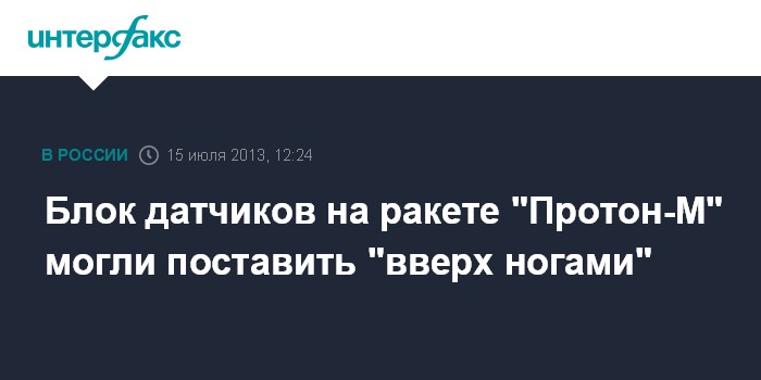 Москва. 15 июля. INTERFAX.RU - Авария ракеты-носителя "Протон-М" с тремя спутниками "Глонасс-М" могла произойти из-за неправильной установки блока датчиков угловых скоростей, сообщил "Интерфаксу" в понедельник источник, близкий к расследованию.