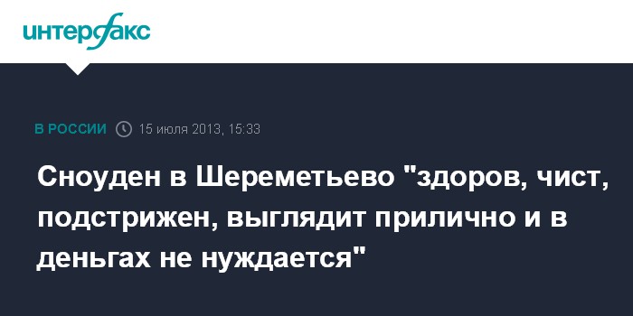 Сноуден в Шереметьево "здоров, чист, подстрижен, выглядит прилично и в деньгах не нуждается"