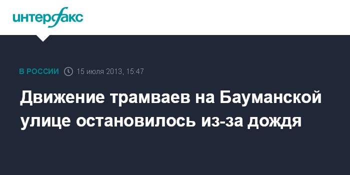 Москва. 15 июля. INTERFAX.RU - Из-за ливня в понедельник днем остановлено движение трамваев в Москве на Бауманской улице, сообщили "Интерфаксу" в пресс-службе департамента транспорта столицы.