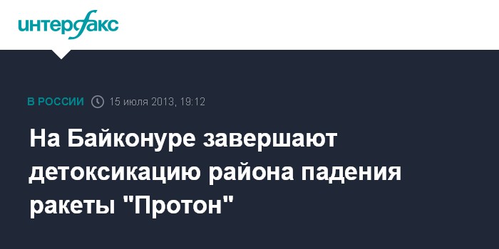 Астана. 15 июля. INTERFAX.RU - Работы в районе падения ракеты-носителя "Протон-М" на Байконур продолжаются. Как сообщила пресс-служба Казкосмоса, проведена детоксикация почвы на площади 9680 кв.метров, что составляло 80% от общей площади, планируемой к обработке.