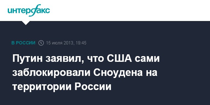 Остров Гогланд (Ленинградская область). 15 июля. INTERFAX.RU - США заблокировали экс-сотрудника ЦРУ Эдварда Сноудена на территории России, не давая возможность другим странам разрешить пролет с ним через их территорию, заявил президент РФ Владимир Путин на встрече со студентами.