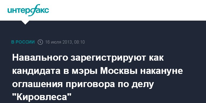 Газета подчеркивает, что оппозиционер станет кандидатом в мэры столицы накануне оглашения 18 июля приговора по делу "Кировлеса". Член МГИКа с правом совещательного голоса Андрей Бузин также подтвердил изданию, что вопрос о регистрации оппозиционера включен в повестку дня на среду.