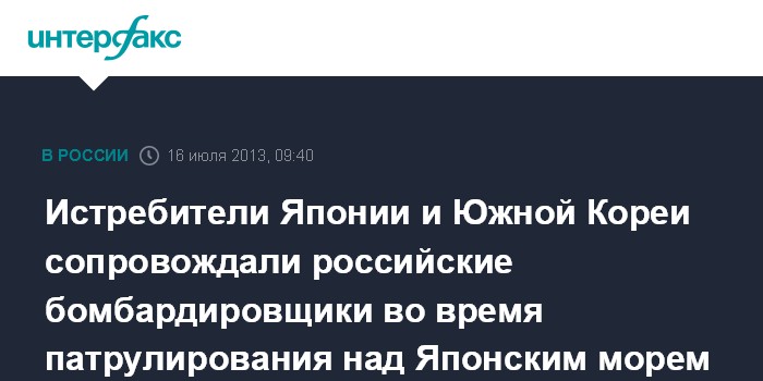 Москва. 16 июля. ИНТЕРФАКС-АВН - Полеты двух российских стратегических бомбардировщиков Ту-95МС, выполнявших учебные задачи в рамках проводимой проверки боевой готовности войск Восточного военного округа, сопровождали истребители Южной Кореи и сил самообороны Японии, сообщает управление пресс-службы и информации Минобороны РФ.